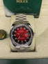 The Rolex with an automatic movement, finished in a sleek silver tone and paired with a striking red dial, brings together bold design and timeless sophistication. Its vibrant red dial delivers a powerful visual impact, creating a unique contrast with the refined silver case and bracelet that enhances its premium presence.